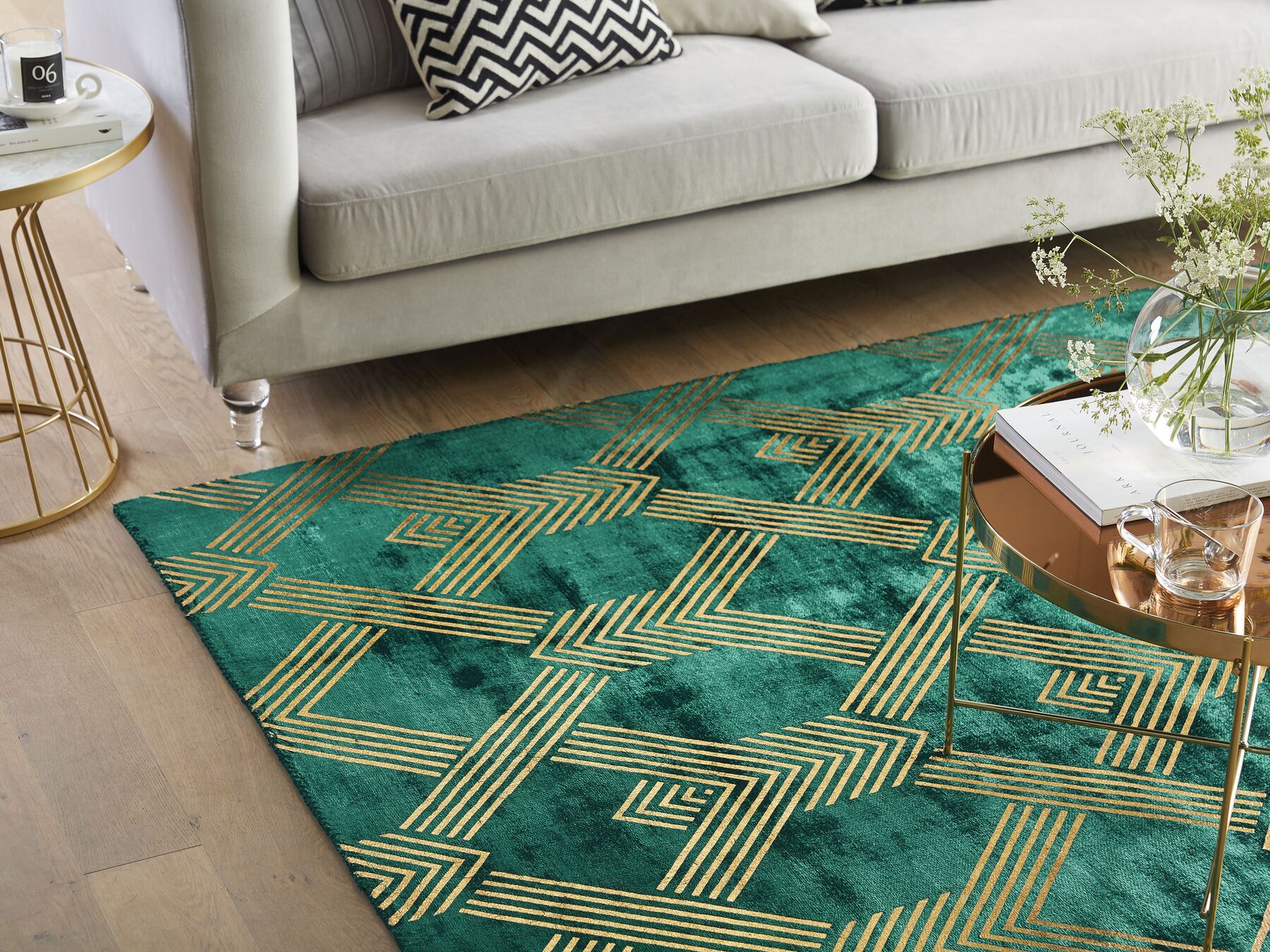 Alfombra verde oscuro: si posees una decoración ecléctica una alfombra en verde oscuro te quedará genial presidiendo el salón. Añade accesorios con toques dorados para darle más fuerza a este espacio lleno de vida y personalidad; Alfombra verde lima: es un color muy llamativo, pero queda muy bien en zonas como el comedor.