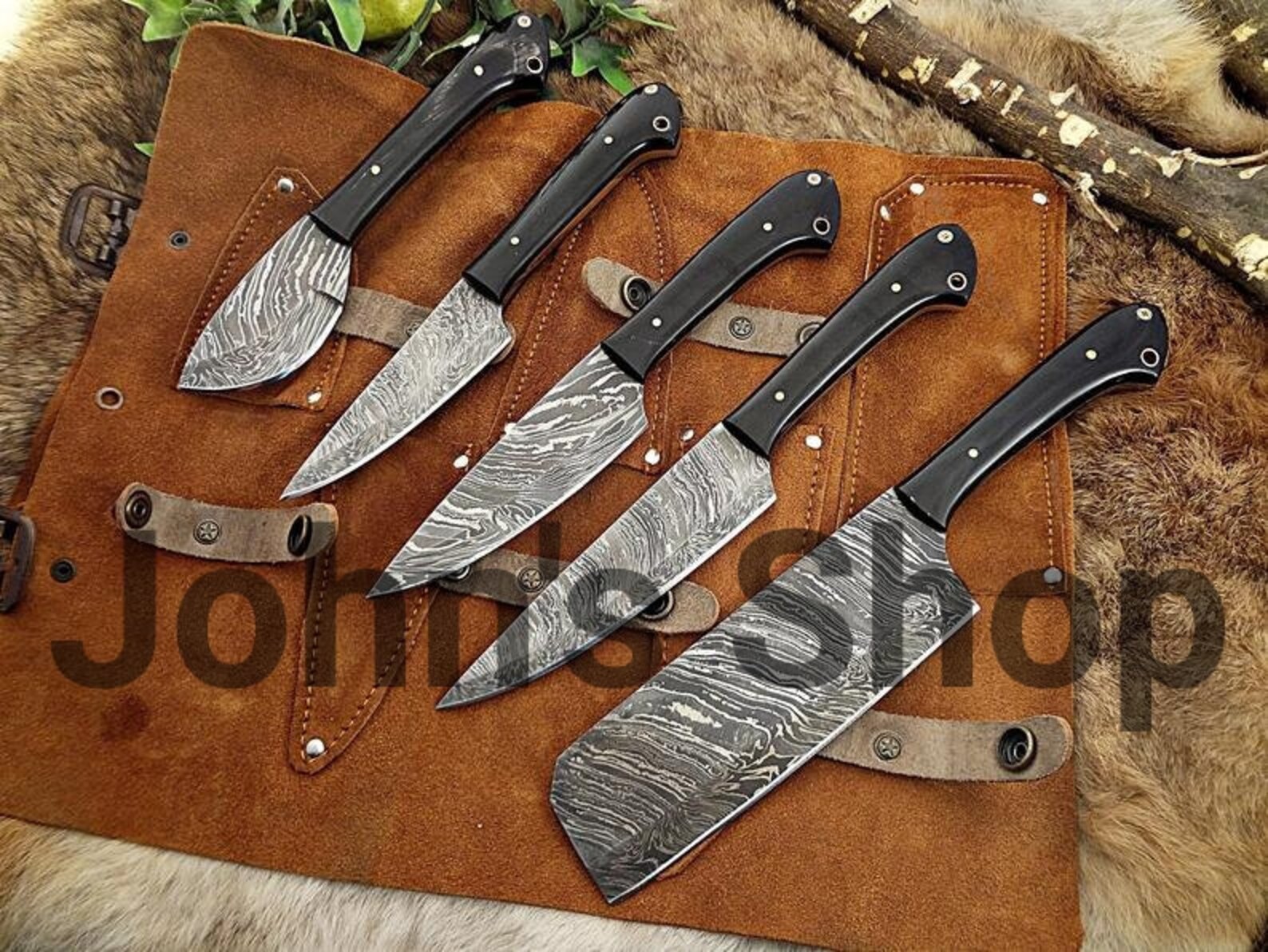 Juego de chef de acero de Damasco hecho a mano personalizado 5 uds, cuchillos de cocina de comedor, juego de chef de Damasco, cuchillos, juego completo de cuchillos de cocina. (21) 117,00 €. 389,99 € (70 % de descuento) Envío GRATIS.