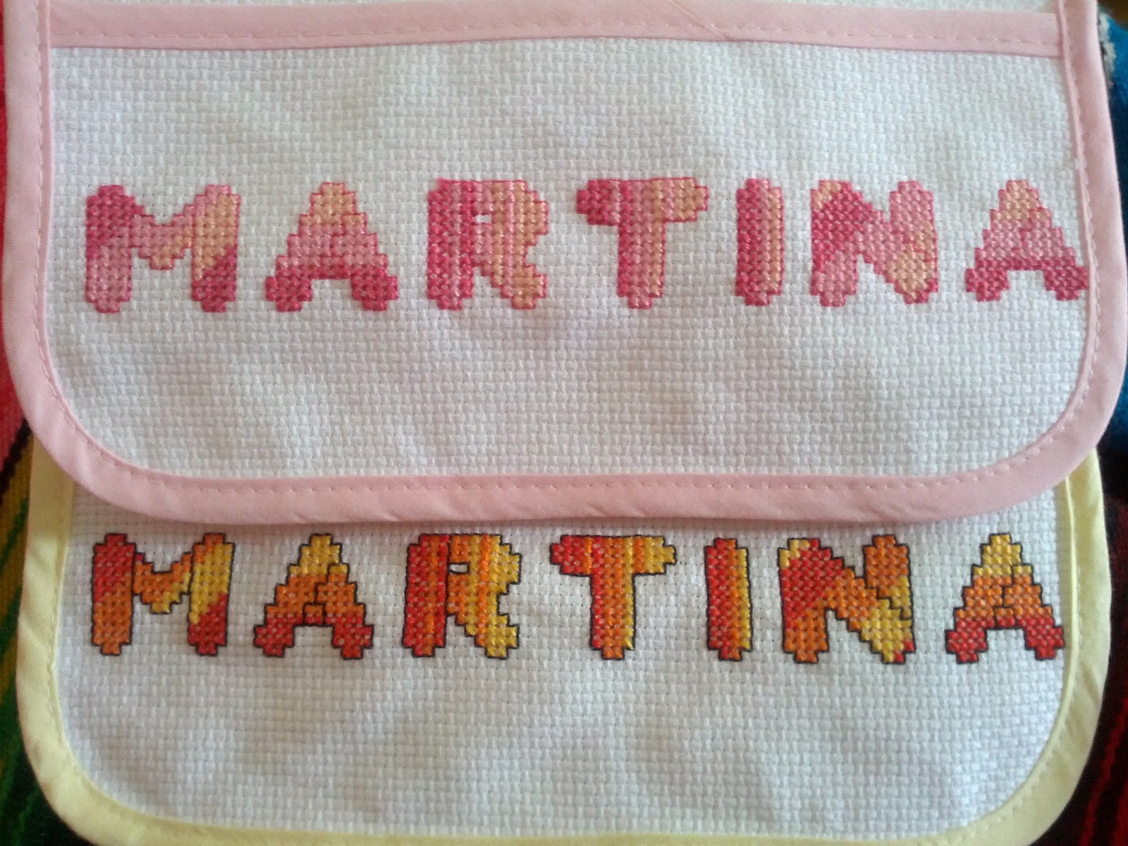 El punto de cruz es muy recurrente a la hora de decorar baberos. Normalmente se les suele bordar un dibujo infantil o el nombre del bebé. En esta técnica existen diferentes tipos de letras, para las cuales se necesitan patrones. En esta sección encontraréis varias ideas para que podáis inspiraros y algún tutorial.