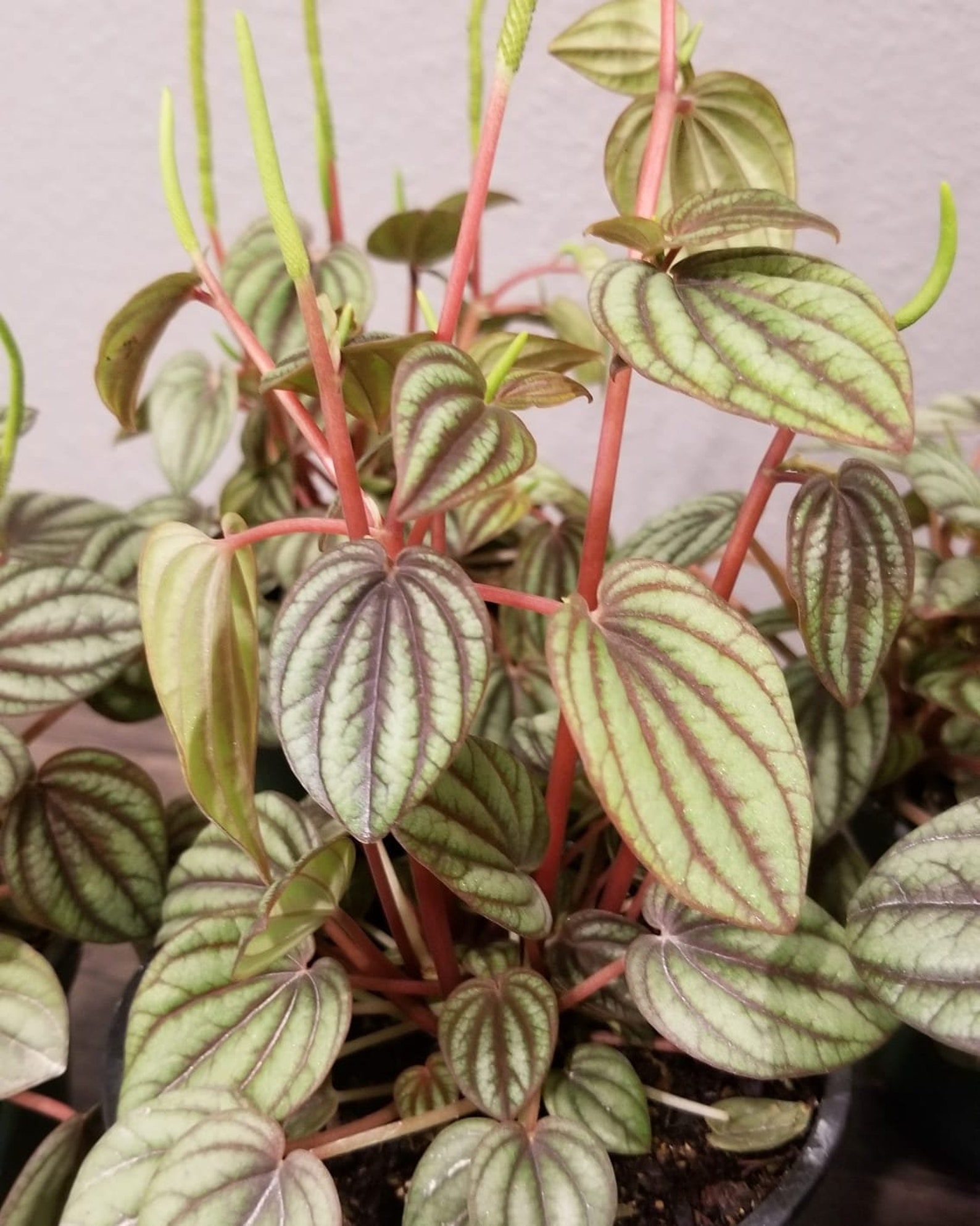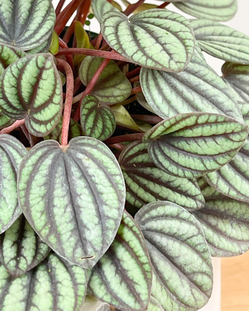 The Peperomia 'Piccolo Banda', also known by its scientific name Peperomia albovittata 'Piccolo Banda', is a cute, compact houseplant that is great for desktops or small windowsills. The coin shaped leaves are an iridescent silver striped with deep green and purple veins. This plant is low maintenance and propagates easily.