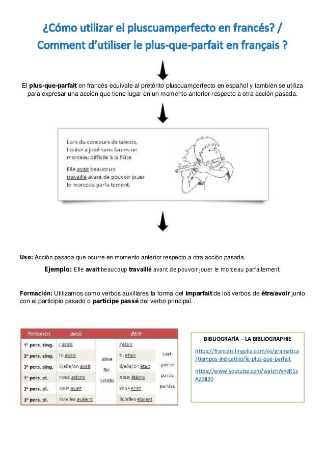 El pluscuamperfecto, (le plus-que-parfait) es un tiempo compuesto del pasado, muy latino él, y un tanto especial, porque NO SE USA SOLO. Se usa siempre en colaboración de otro verbo. En francés se forma de la siguiente manera: verbos auxiliares avoir o être en imperfecto + el participio pasado del verbo conjugado Aquí tienes ejemplos: Il avait mangé: el había comido Il était parti: el.