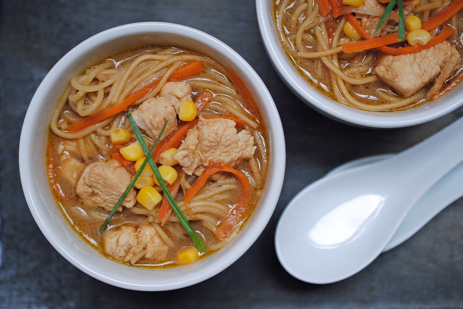 250 Calorías. Fácil de preparar. Ingredientes: 2 Pechugas de pollo, cortadas en tiras delgadas. 1 Zanahoria, pelada y en rodajas finas. 1 Taza de col china (pak choi) en tiras. 1 Taza de champiñones en láminas. 100 Gramos de fideos chinos. 2 Dientes de ajo, picados. 1 Cucharada de jengibre fresco, rallado. 4 Tazas de caldo de pollo.